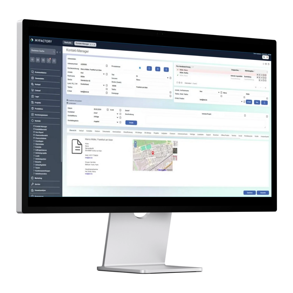 Das Myfactory CRM-Modul ist mehr als eine Adressverwaltung. Es bildet alle relevanten Informationen und Interaktionen über Leads, Kunden und Partner übersichtlich ab – für Vertrieb, Marketing und Service.