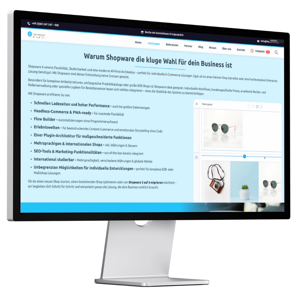 Viele Besucher:innen sind überrascht, wenn sie erfahren, dass unsere Website technisch auf einem Onlineshop basiert. Und genau das ist die Botschaft: Mit dem richtigen Setup lässt sich Shopware so weit individualisieren, dass es visuell und funktional nicht mehr als Shopsystem erkennbar ist – sondern sich vollständig an das Geschäftsmodell und das Markenerlebnis anpasst.